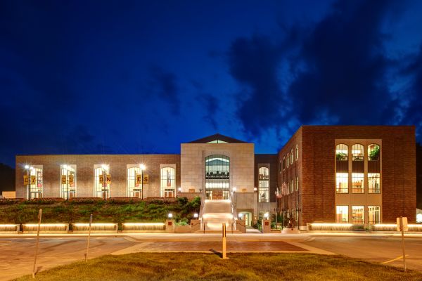A central lounge with a glowing fireplace anchors the experience, surrounded by adaptable banquet halls, meeting rooms, and student spaces that keep the building active year-round. Set into the hillside with a dramatic east stair, the center naturally draws visitors from the Iowa State Center up into a vibrant hub of connection.