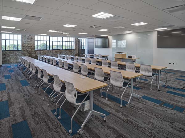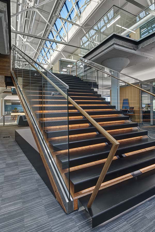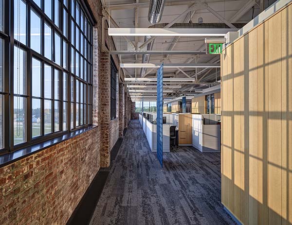 On the top three floors of the historic John Deere "R" Building at TechWorks, Lincoln Savings Bank re-centered its Waterloo operations in a flexible, tech-forward workplace that honors the site's manufacturing past. The design reinstates the historic fenestration rhythm and reveals the original concrete frame and columns, pairing those bones with contemporary work zones, collaboration areas, and hospitality touches. A high-performance underfloor air distribution (UFAD) system threads comfort and efficiency through the large floorplates without compromising the building's character.