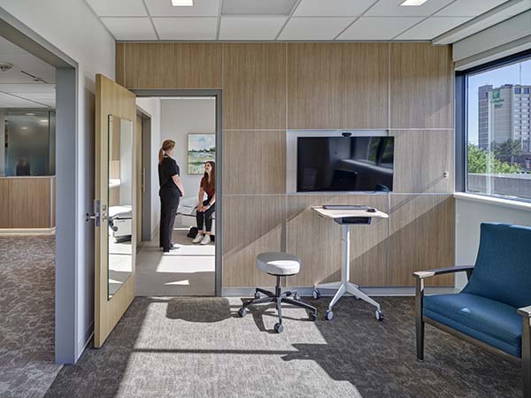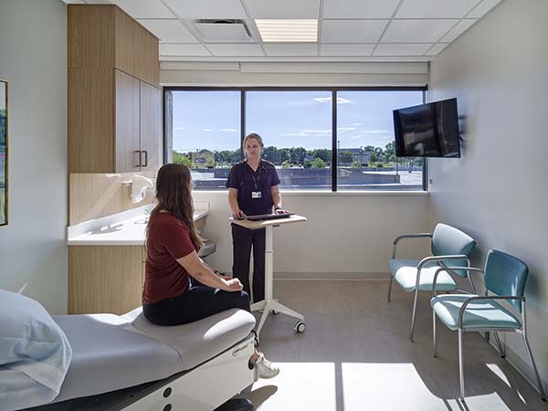 Phase 1 realizes the vision to create a center of excellence that encompasses comprehensive, multidisciplinary and patient-centered compassionate cancer care for Iowans, expanding cancer care services and uniting nontraditional cancer care, survivorship and outpatient palliative care support services. A new entrance identity and expanded clinic facilities gave patients a clear sense of arrival, while daylight, natural materials, and intuitive wayfinding created spaces that reduce stress and reinforce dignity. Dedicated environments for wellness and survivorship affirmed the hospital's philosophy of treating the whole person.