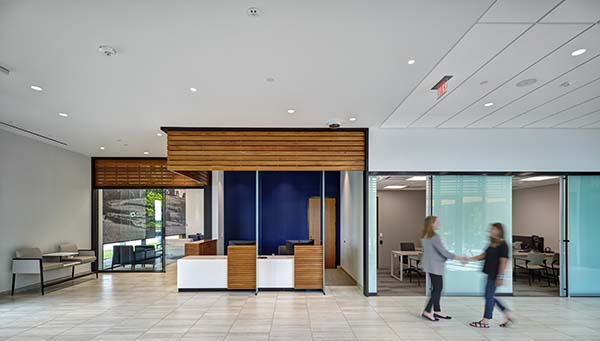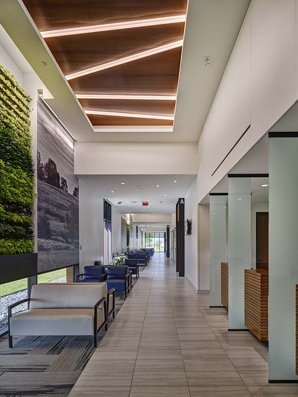 A new prominent north-side entrance with drop-off canopy, lobby, and centralized registration clarifies campus identity and arrival. Centralized registration streamlines intake while maintaining privacy with visually distinct desks that remain operationally linked. The lobby and concourse connect the Rural Health Clinic, Visiting Specialty Clinic, Therapy/Rehabilitation, Infusion Center, and education spaces with carefully designed sightlines to simplify wayfinding.