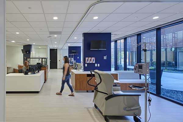 The expansion includes an upgraded Rural Health Clinic and Visiting Specialty Clinic, a new Infusion Center with views to a secluded courtyard, an integrated Therapy and Rehabilitation Center, and added educational and community spaces. Human-centered design—natural light, warm finishes, calming colors, living green walls, and regional imagery—reduces stress and connects patients with nature.
