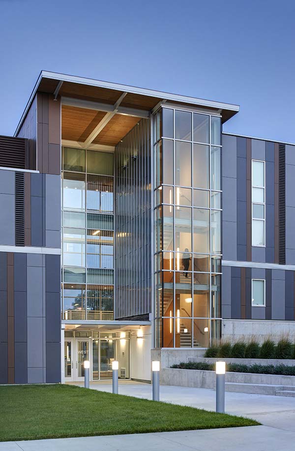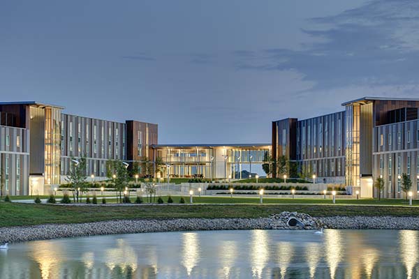 Completed in 2015, Campus View replaces aging housing with a modern, community-forward residence hall that keeps students a short walk from class and plugged into campus life. The plan emphasizes daylight, shared lounges, and outdoor connections, taking advantage of views across NIACC's lakes while stitching the hall back to the academic core. Three suite types—Double, Semi-Private, and Full—pair private bedrooms with shared living, and are supported by commons, study areas, and an on-site dining program. Capacity scales to serve nearly four hundred residents, reinforcing a true residential experience at a community-college scale.