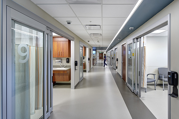 Design prioritized a patient-centered, healing environment by orienting the addition to maximize daylight and views, reinforcing the therapeutic link to nature. Durable, warm materials—zinc panels, Ipé wood, glass, travertine tile, and wood finishes—shift the building from institutional to uplifting and human-centered. A cantilevered second floor doubles as a covered drop-off and conceals rooftop mechanicals. Sustainable systems and infrastructure upgrades improve efficiency, resilience, and future capacity.