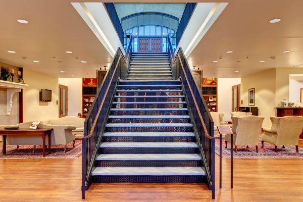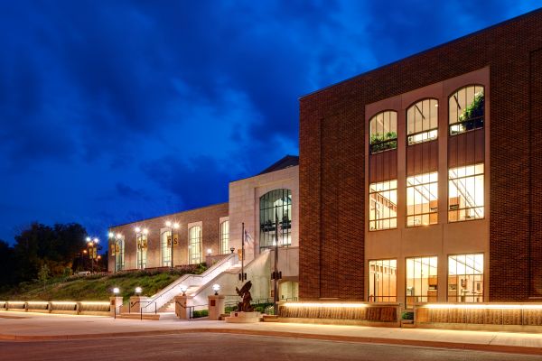A central lounge with a glowing fireplace anchors the experience, surrounded by adaptable banquet halls, meeting rooms, and student spaces that keep the building active year-round. Set into the hillside with a dramatic east stair, the center naturally draws visitors from the Iowa State Center up into a vibrant hub of connection.