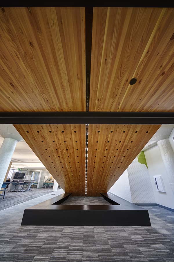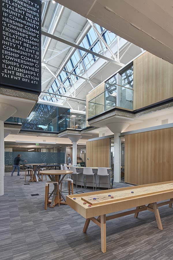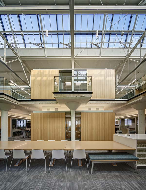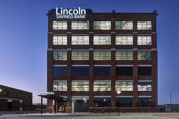 On the top three floors of the historic John Deere "R" Building at TechWorks, Lincoln Savings Bank re-centered its Waterloo operations in a flexible, tech-forward workplace that honors the site's manufacturing past. The design reinstates the historic fenestration rhythm and reveals the original concrete frame and columns, pairing those bones with contemporary work zones, collaboration areas, and hospitality touches. A high-performance underfloor air distribution (UFAD) system threads comfort and efficiency through the large floorplates without compromising the building's character.