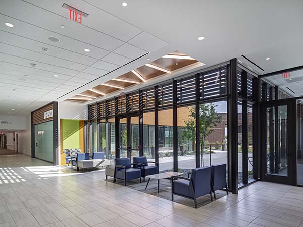 A new prominent north-side entrance with drop-off canopy, lobby, and centralized registration clarifies campus identity and arrival. Centralized registration streamlines intake while maintaining privacy with visually distinct desks that remain operationally linked. The lobby and concourse connect the Rural Health Clinic, Visiting Specialty Clinic, Therapy/Rehabilitation, Infusion Center, and education spaces with carefully designed sightlines to simplify wayfinding.