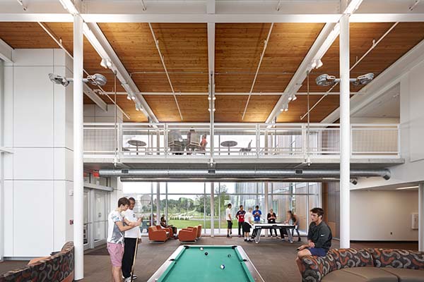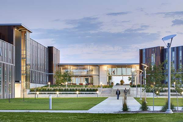 Completed in 2015, Campus View replaces aging housing with a modern, community-forward residence hall that keeps students a short walk from class and plugged into campus life. The plan emphasizes daylight, shared lounges, and outdoor connections, taking advantage of views across NIACC's lakes while stitching the hall back to the academic core. Three suite types—Double, Semi-Private, and Full—pair private bedrooms with shared living, and are supported by commons, study areas, and an on-site dining program. Capacity scales to serve nearly four hundred residents, reinforcing a true residential experience at a community-college scale.